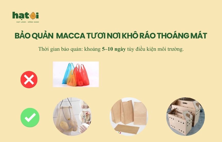 • Để trong túi nilon kín khi hạt còn ẩm: Hạt macca tươi có độ ẩm tự nhiên. Nếu bạn bịt kín hoàn toàn, hơi nước không thoát ra được. Hạt sẽ hấp hơi và mốc từ bên trong.